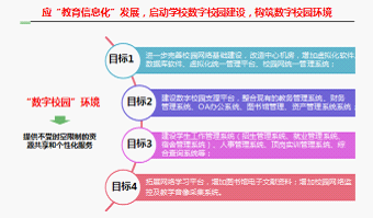 体系结构: 将校园网、广播网、有线电视网、电话网四网合一——实现数字化学习、数字化教学、数字化科研和数字化管理,创建数字化的生活空间,创建虚拟社区空间,为学生、教师、管理者提供数字化学习与生活体验。